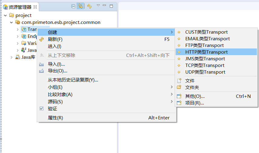 1. 在资源管理器中,右键点击公共Module中"Transport",选择"创建->HTTP类型Transport"菜单项,如下图所示: