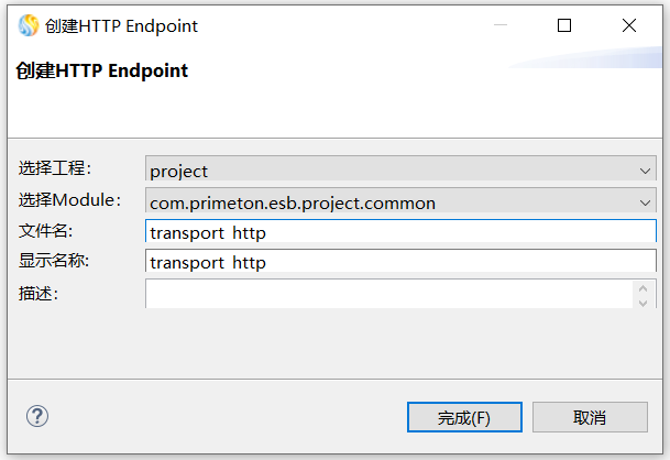 2. 在弹出的"创建HTTP类型Transport"向导中,选择当前的工程、Module,并输入文件名及显示名称,点击"完成"按钮,如下: