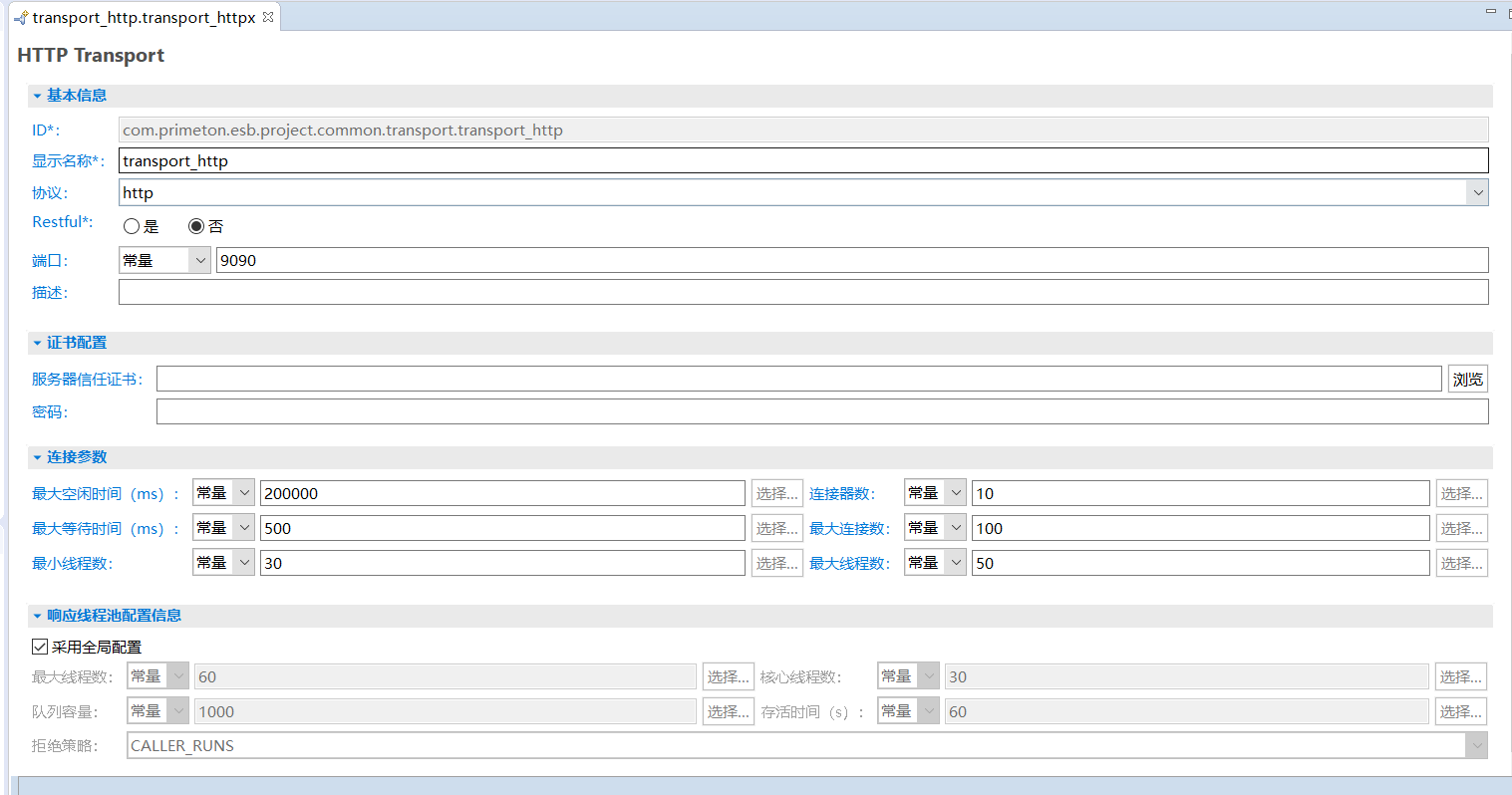 • 文件名:用于存储HTTP Transport配置的文件名。需要保证在ESB工程中唯一。