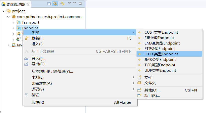 在资源管理器中,右键点击公共Module中"Endpoint",选择"创建->HTTP类型Endpoint"菜单项,如下所示: