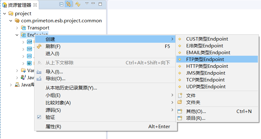 1. 在资源管理器中,右键点击公共Module中"Endpoint",选择"创建->FTP类型Endpoint"菜单项,如下所示: