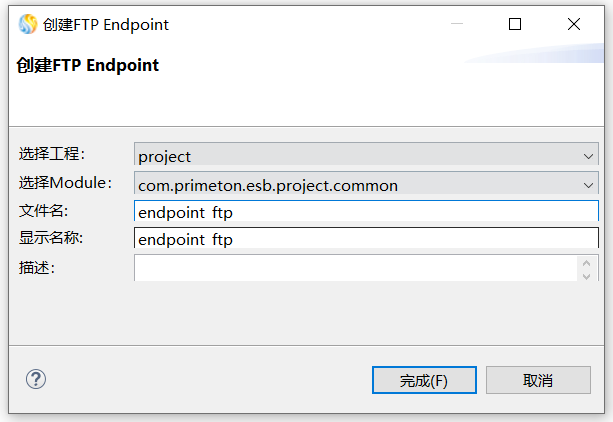 2. 在弹出的"创建FTP类型Endpoint"向导中,选择当前的工程、Module,并输入文件名及显示名称,点击"完成"按钮,如下: