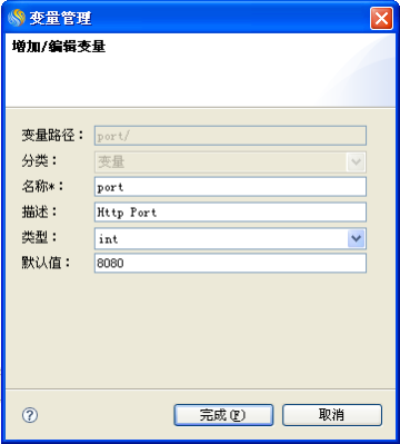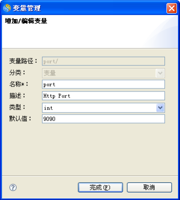b. 修改变量缺省值,将原先的"9090" 改为"8080",如下,点击"完成"按钮,保存变量修改。