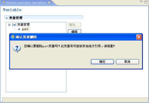 变量删除a. 选择新创建的变量"port",点击"删除"按钮,弹出"确认资源删除",如下: