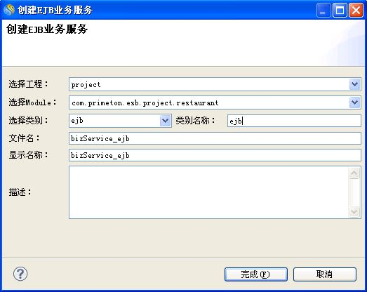 2. 在弹出的"创建EJB业务服务"向导中输入创建EJB业务服务的各选项,点击"完成"按钮生成EJB业务服务。