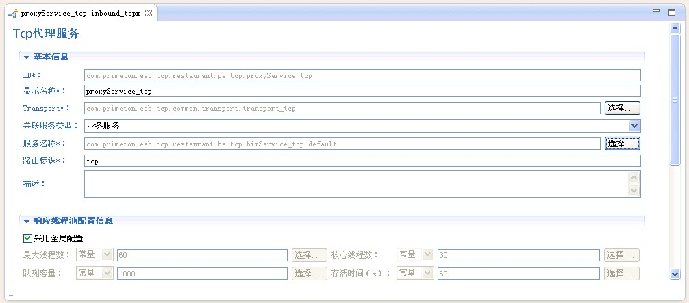 • Transport:TCP代理服务关联的Transport,即TCP代理服务所处理请求的来源。系统运行中,Transport完成请求的接入,然后交予TCP代理服务处理。ESB工程创建时,在公共Module中自动生成缺省的TCP Transport,TCP代理服务选择缺省的TCP Transport即可。