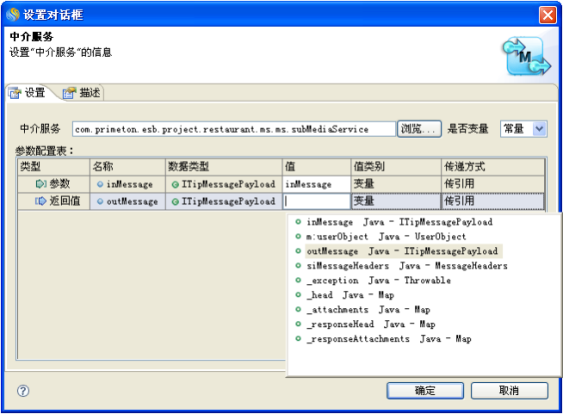 • 返回值:其名称为outMessage,该返回值是业务服务或者是子中介的返回值。