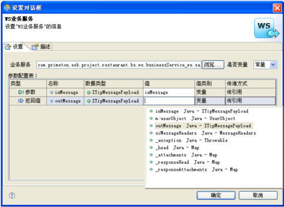 在"设置对话框"窗口中的参数配置表中输入参数和返回值,点击"确定"按钮完成WS业务服务的参数设置,如下图所示: