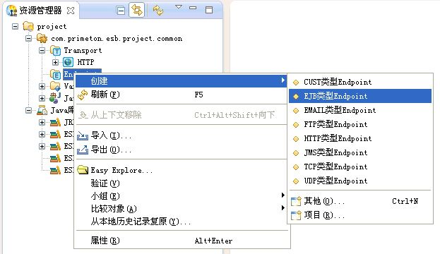 在资源管理器中,选中新建的公共Module中的"Endpoint",点击右键,选择"创建->EJB类型Endpoint"菜单项,创建EJBEndpoint,如下图所示。