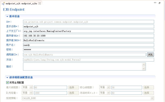 参数名称 参数描述 上下文工厂 不同的EJB server需要配置不同的工厂串 提供着URL EJB Server的地址和端口 提供着JNDI EJB调用的JNDI 用户名 EJB Server的口令(如果安全要求强制) 密码 EJB Server的登录密码,(如果安全要求强制) 调用接口 EJB对应的jar包所调用的远程接口 方法 EJB对应的jar包所调用的远程方法