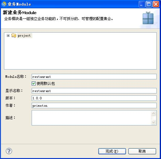 在"业务Module"向导中,输入业务Module的相关信息,点击"完成"按钮,创建业务Module,如下图所示。