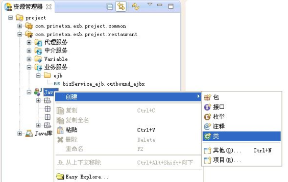 创建Java方法。在资源管理器中右键点击业务Module中的Java,选择"创建->类" 菜单项,如下图所示。