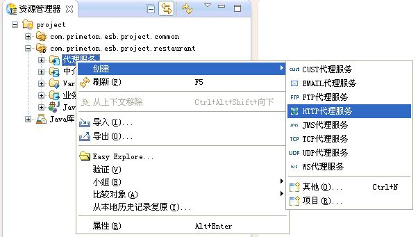 在资源管理器中,选中新建的业务Module的代理服务项,点击右键,选择"创建->HTTP代理服务"菜单项,创建HTTP代理服务,如下图所示。
