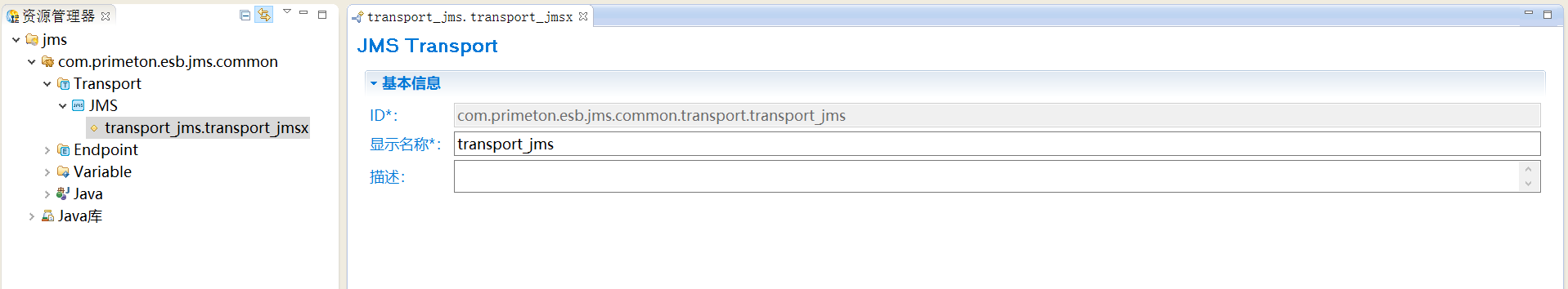单击“完成”,打开JMS Transport编辑器,修改相关参数,JMS Transport创建完成,如下图所示。