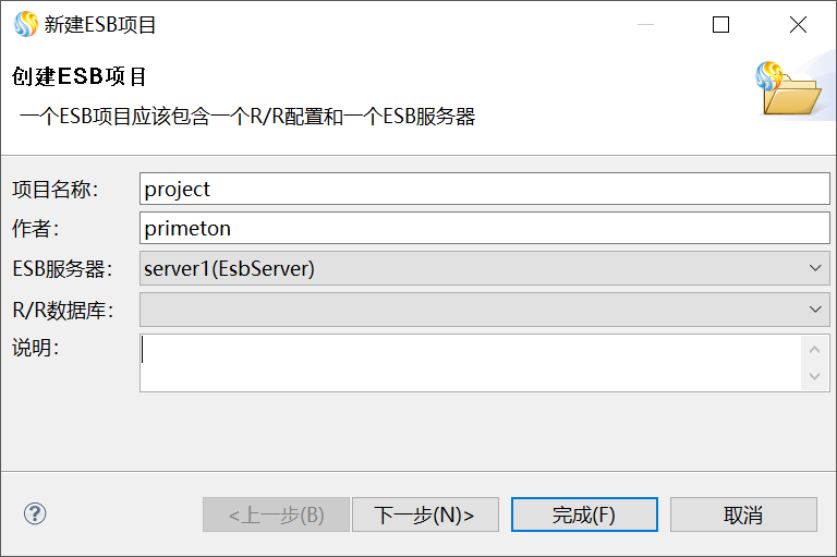 在“新建ESB项目”界面,输入“项目名称”、“作者”,选择“ESB服务器”、“R/R数据库”等基本信息。如下图所示。