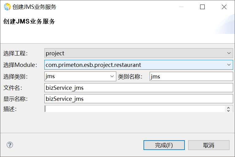 在资源管理器中,在新建的业务Module“com.primeton.esb.project.restaurant”的“业务服务”上,鼠标右键选择“创建 > JMS业务服务”,创建JMS业务服务,如下图所示。