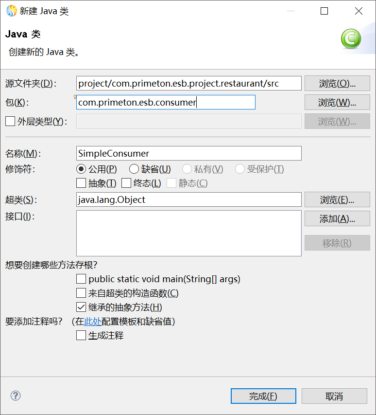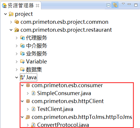 package com.primeton.esb.httpToJms.httpToJms; import java.util.HashMap; import com.primeton.esb.message.ITipMessagePayload; import com.primeton.esb.message.MessageConstants; import com.primeton.esb.message.TipMessageBuilder; public class ConvertProtocol { private static String httpReplyText ="<soapenv:Envelope xmlns:soapenv=\"http://www.w3.org/2003/05/soap-envelope\">" +"<soapenv:Body>" +" <ns:sayHiResponse xmlns:ns=\"http://quickstart.helloworld/xsd\">" +" <ns:return>Hello ESB!</ns:return>" +" </ns:sayHiResponse>" +" </soapenv:Body>" +"</soapenv:Envelope>"; /** * 根据HTTP请求消息构建JMS消息的消息体 * * @param httpRequestMsg * @return * @throws Exception */ public static ITipMessagePayload doHttpToJms( ITipMessagePayload httpRequestMsg) throws Exception { String requestText = (String) httpRequestMsg.getMessagePayload(); //根据messagePayload构建TipMessageBuilder TipMessageBuilder builder = TipMessageBuilder.withPayload(requestText); //定义消息头 HashMap<String, Object> messageHeaders = new HashMap<String, Object>(); //设置系统头-消息传递方向为单向消息 builder.setSystemHeader(MessageConstants.MESSAGE_INVOKE_TYPE, MessageConstants.ONE_WAY); //设置消息头 builder.setMessageHeaders(messageHeaders); //构建出JMS请求消息 return builder.build(); } /** * 自定义返回HTTP响应消息 * * @param httpRequestMsg * @return * @throws Exception */ public static ITipMessagePayload createHttpReply(ITipMessagePayload httpRequestMsg) throws Exception { String replyText = httpReplyText; //根据messagePayload构建TipMessageBuilder TipMessageBuilder builder = TipMessageBuilder.withPayload(replyText); //根据HTTP请求消息得到系统头 builder.copySystemHeaders(httpRequestMsg.getSystemHeaders()); //根据HTTP请求消息得到协议头 builder.setProtocolHeaders(httpRequestMsg.getProtocolHeaders()); //构建出HTTP响应消息 return builder.build(); } }同样的方法创建类“SimpleConsumer”和类“TestClient”,如下图所示。