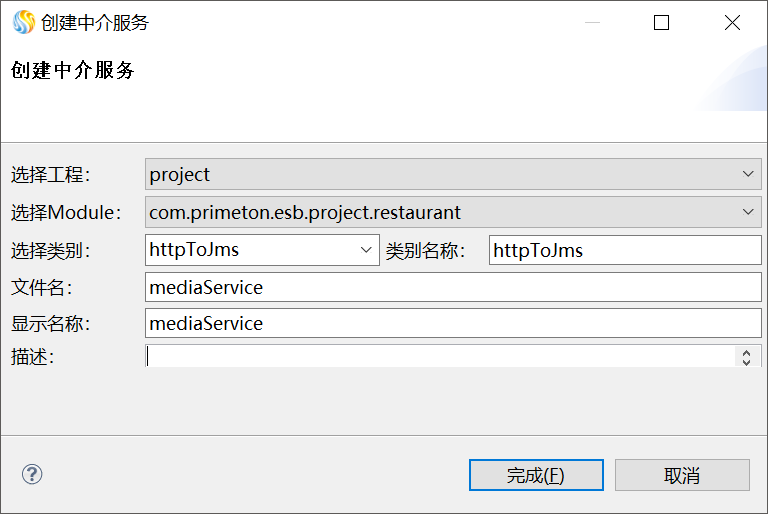 在资源管理器中,在新建的业务Module“com.primeton.esb.project.restaurant”的“中介服务”上,鼠标右键选择“创建 > 中介服务”,如下图所示。