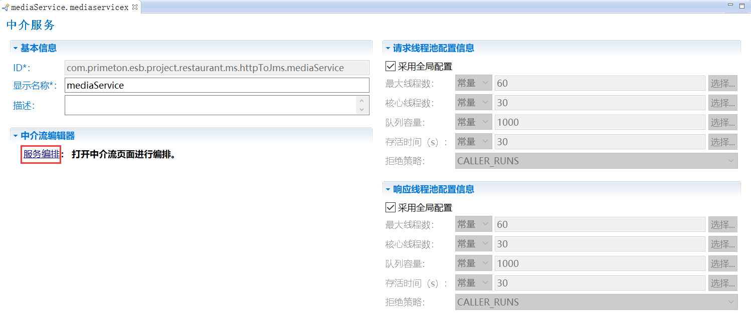 单击“完成”,在HTTP代理服务的编辑界面中,需要输入"URI"并设置引用的中介服务,如下图所示。