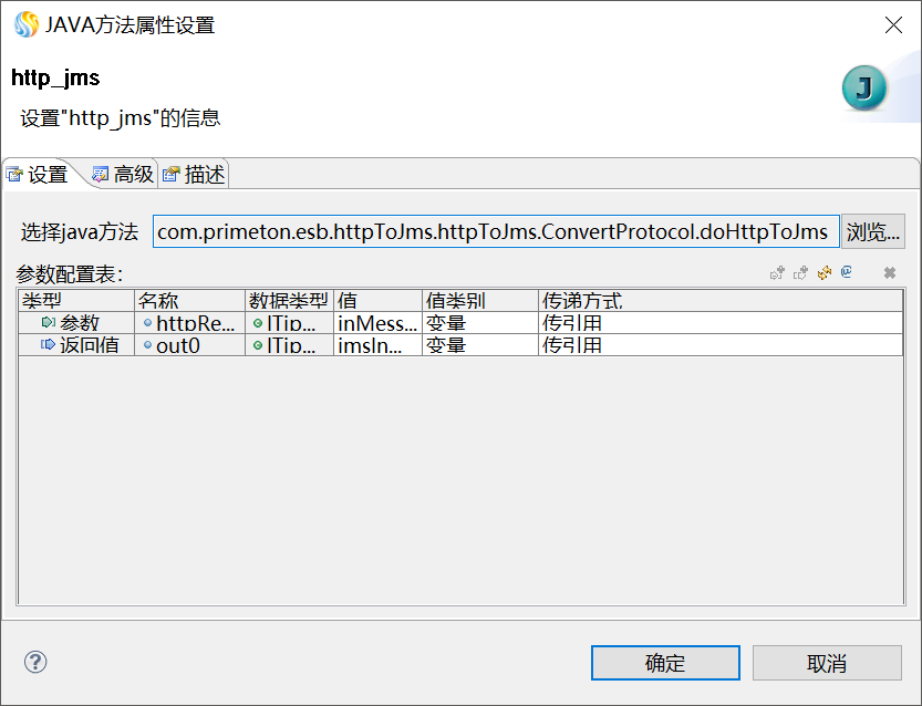 双击编辑区中的"http_jms"JAVA方法图元,在"JAVA方法属性设置"窗口中,单击"浏览...",弹出"选择java方法"窗口,在"选择要打开的类型的输入框中输入类名"ConvertProtocol",在"匹配的类型"中选中ConvertProtocol,单击“下一步”再选中doHttpToJms方法,如下图所示。