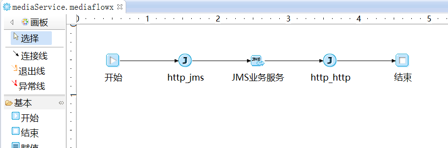 在"中介服务"编辑页面单击“服务编排”链接,进入编排中介服务的界面。在"选用板"中将"JAVA方法"和"JAVA业务服务"图元拖拽到右边的编辑区,并用"连接线"依次连接,如下图所示。