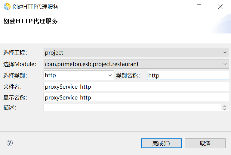 在资源管理器中,在新建的业务Module“com.primeton.esb.project.restaurant”的“代理服务”上,鼠标右键选择“创建 > HTTP代理服务”,创建HTTP代理服务,如下图所示。