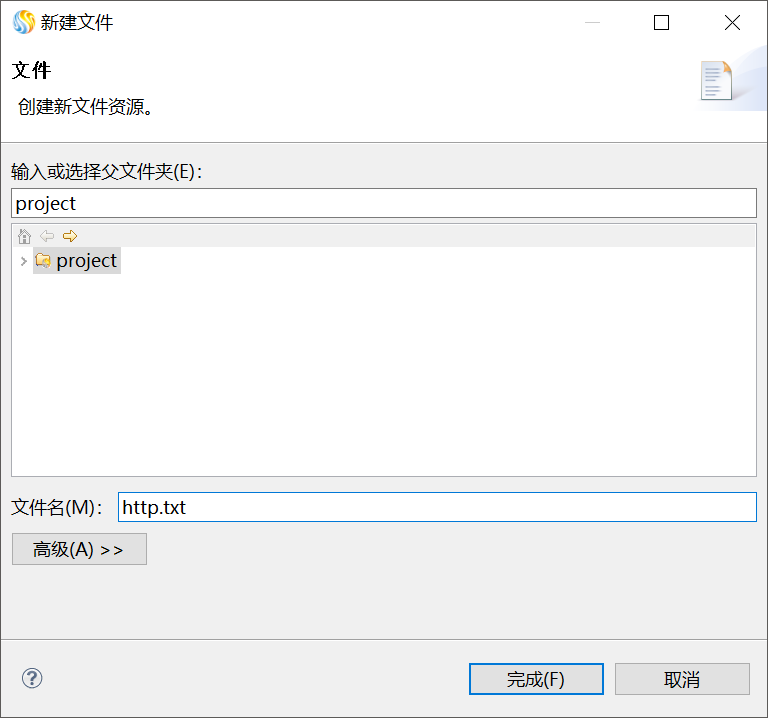 在弹出的“创建HTTP类型Transport”界面,选择当前的工程、Module,并输入文件名及显示名称,如下图所示。