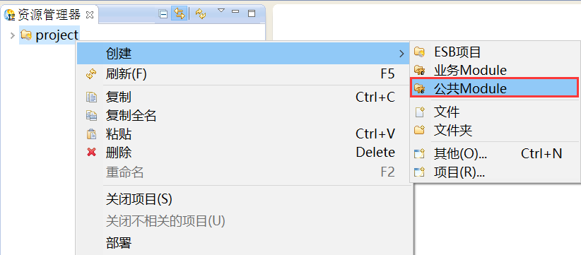 在资源管理器中,鼠标右键选择“创建 > ESB项目”,创建ESB项目,如下图所示。