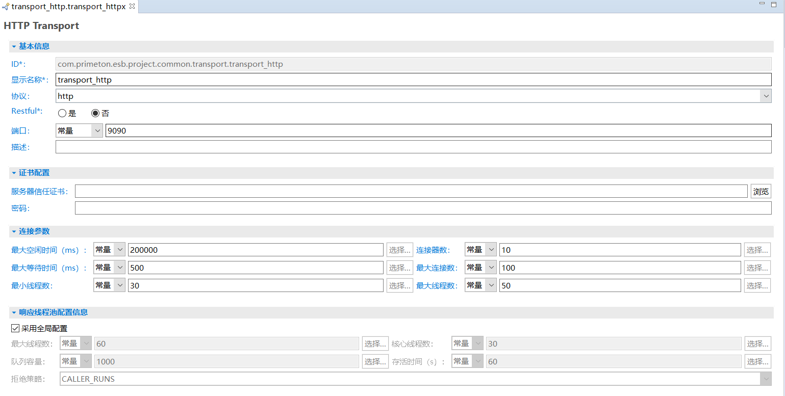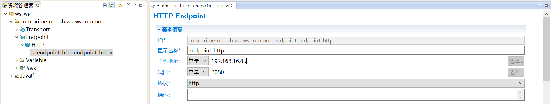 单击“完成”,在资源管理器中,双击创建的HTTP Transport,打开HTTP Transport编辑器,修改相关参数。如下所示。
