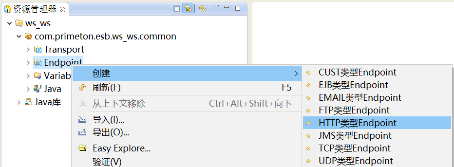 在创建的ESB项目的“Endpoint”上,右键选择“创建 > HTTP类型Endpoint”,如下图所示。