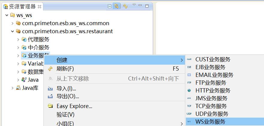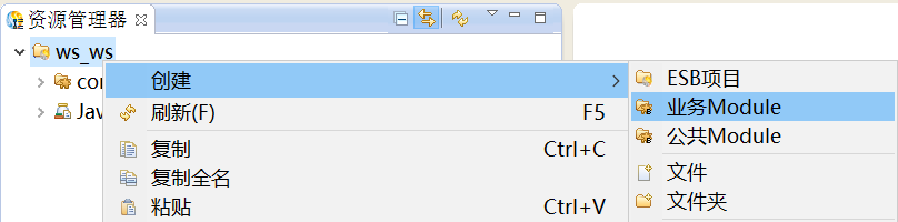 在资源管理器中,在新建的业务Module”的“业务服务”上,鼠标右键选择“创建 > WS业务服务”,创建WS业务服务,如下图所示。