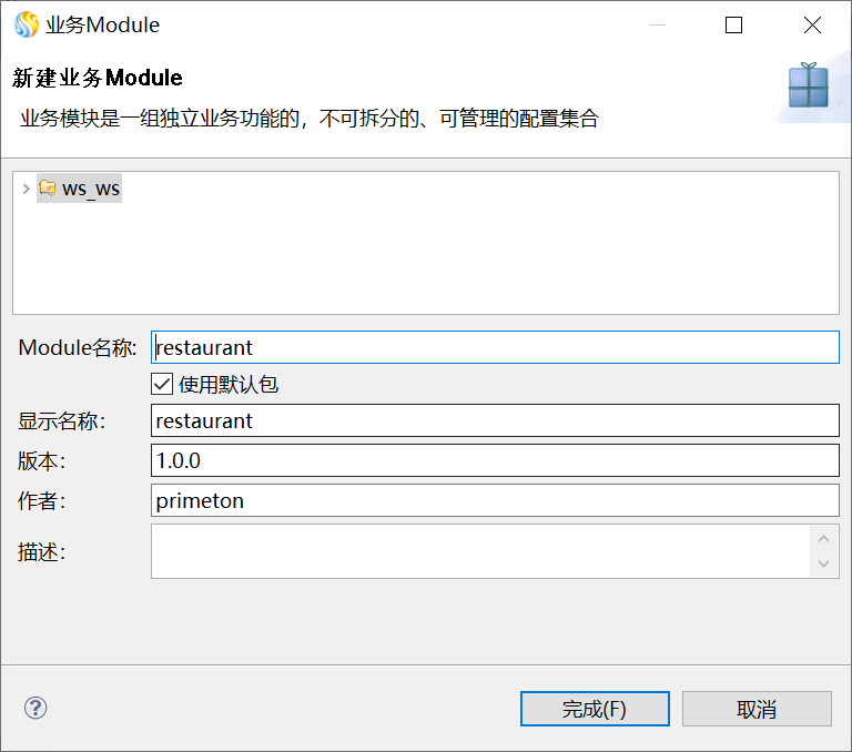 在“业务Module”对话框中,填写Module名称等信息,如下图所示。