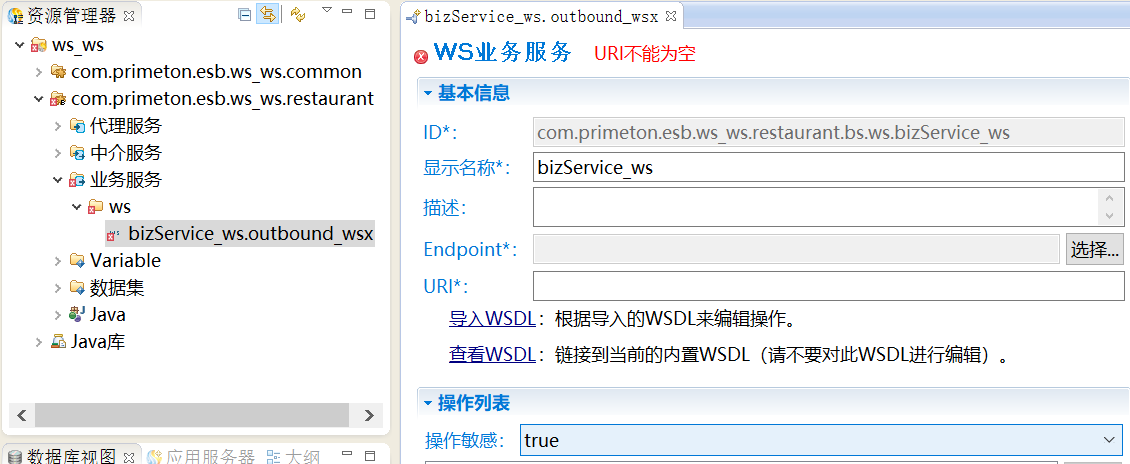 单击“完成”,在打开的“WS业务服务”的编辑界面中,需要选择Endpoint和填写URI信息,如下图所示。