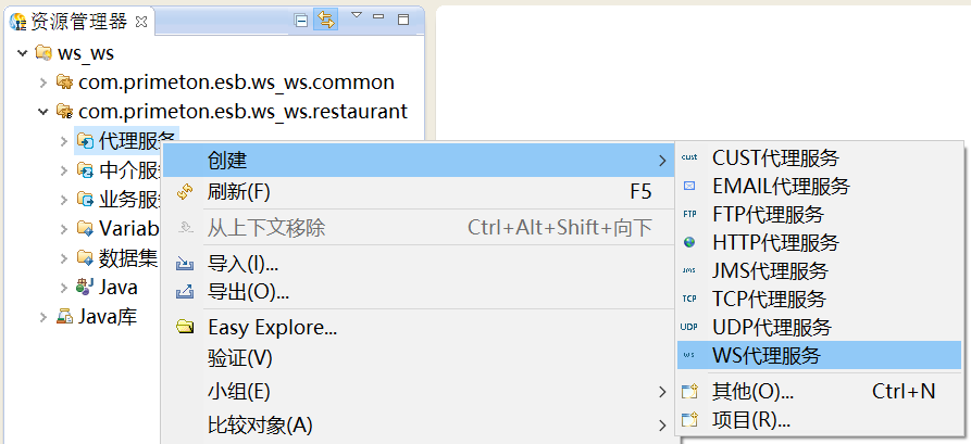 在资源管理器中,在新建的业务Module的“代理服务”上,鼠标右键选择“创建 > WS代理服务”,创建WS代理服务,如下图所示。