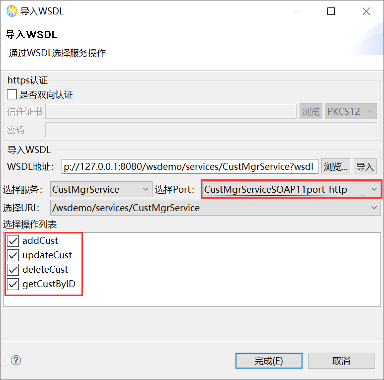 在“WSDL地址”的输入框中输入WSDL地址:http://127.0.0.1:8080/wsdemo/services/CustMgrService?wsdl (opens new window) ,然后单击后面的“导入”,Studio会自动导入WSDL的相关信息,勾选操作列表的操作,最后单击“完成”,完成WSDL的导入步骤,如下图所示。