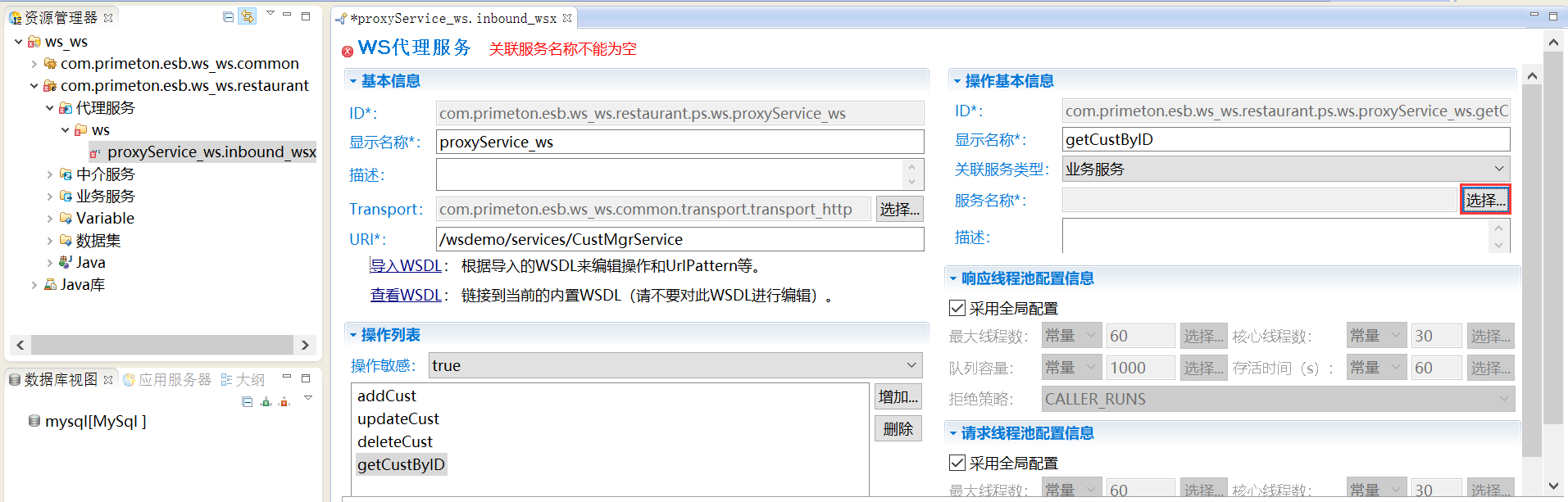 在WS代理服务编辑界面中导入WSDL后,还需要设置“操作列表”中每个操作所对应的WS业务服务。单击“操作列表”中的操作“getCustByID”,会打开设置该操作相关信息的界面,如下图所示。