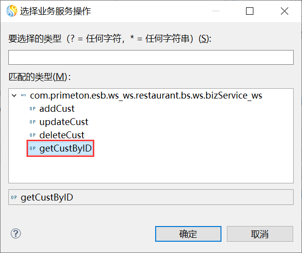 在“操作基本信息”区域,单击“服务名称”后面的“选择...”,弹出“选择业务服务操作”对话框,并选中“getCustByID”,单击“确定”,如下图所示。