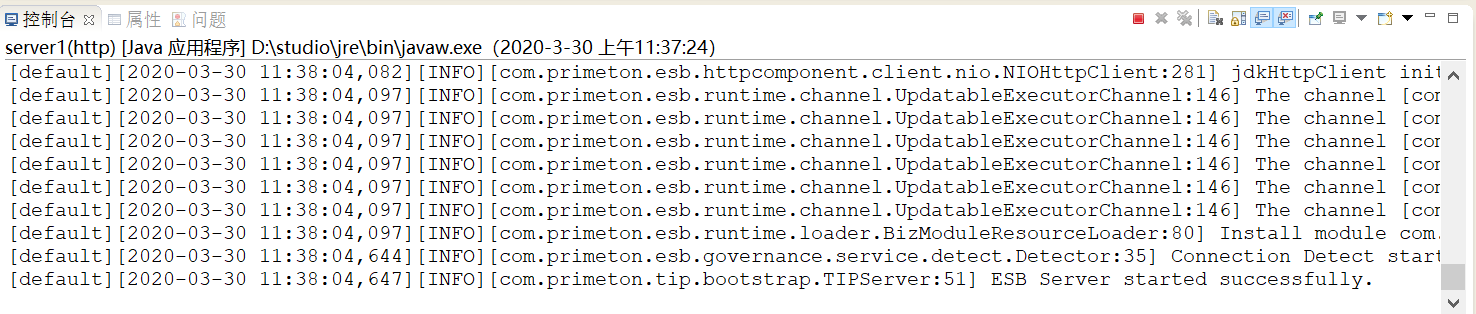 部署完成后,ESB Studio将公共Module和业务Module部署Studio内置的ESB Server上,然后启动ESB Server,如下图所示。
