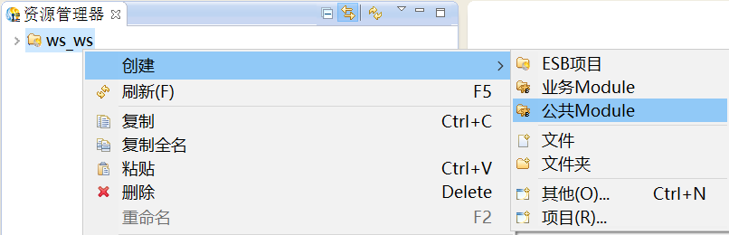 在资源管理器中,鼠标右键选择“创建 > ESB项目”,创建ESB项目,如下图所示。
