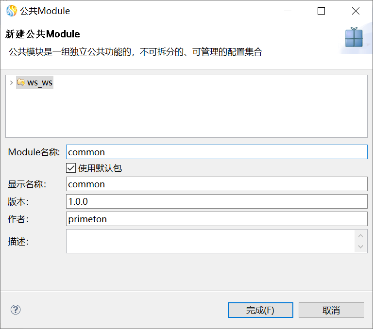 在“公共Module”对话框中,填写Module名称等信息,如下图所示。