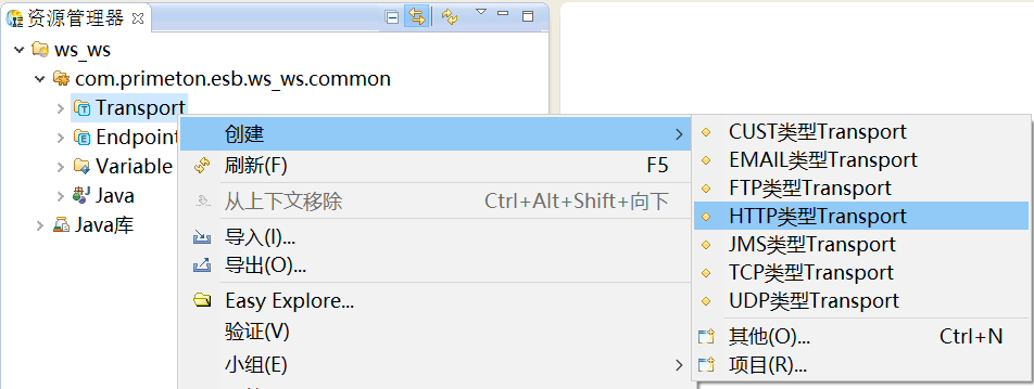 在创建的ESB项目的“Transport”上,右键选择“创建 > HTTP类型Transport”,如下图所示。