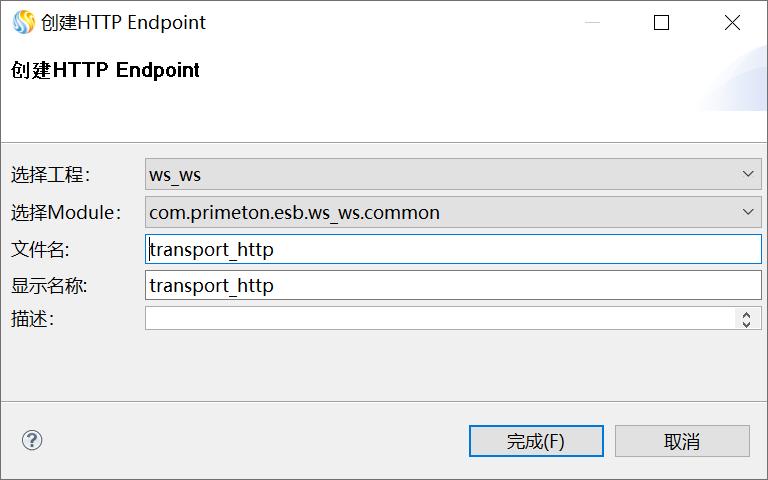 在弹出的“创建HTTP类型Transport”界面,选择当前的工程、Module,并输入文件名及显示名称,如下图所示。