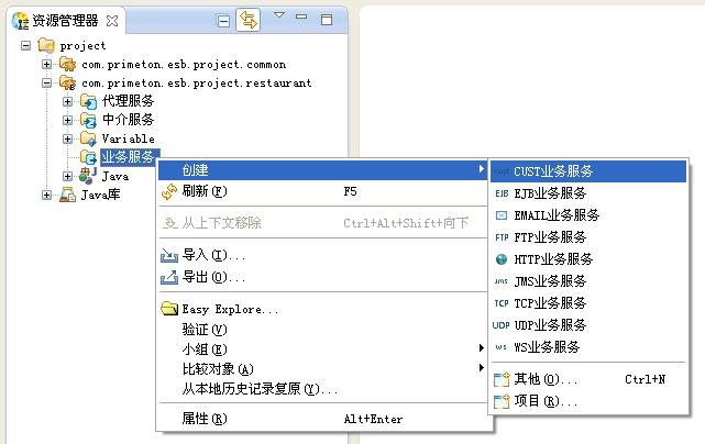 在资源管理器中,选中新建的业务Module"com.primeton.esb.project.restaurant",点击右键,选择"创建->CUST业务服务"菜单项,创建CUST业务服务,如下图所示。