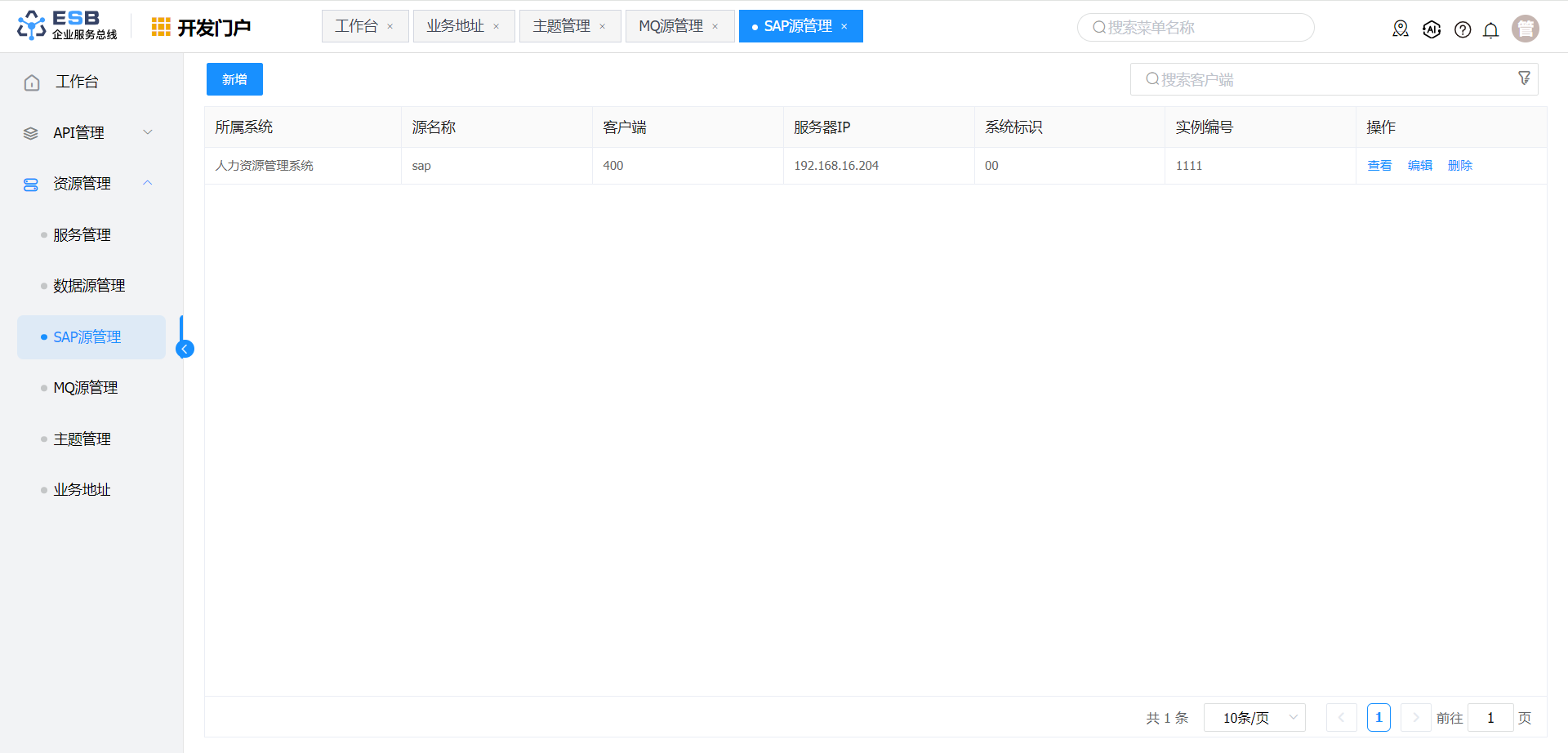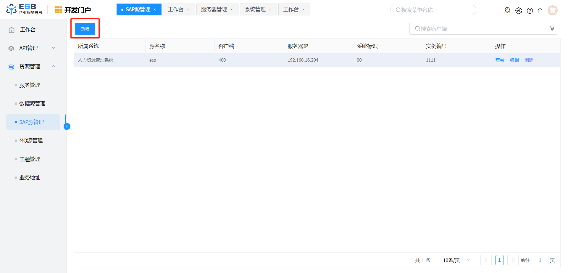1. 开发人员登录系统,进入开发门户,点击菜单“ 资源管理“ >” SAP源管理 ” ,右侧区域显示 “SAP源管理” 界面。