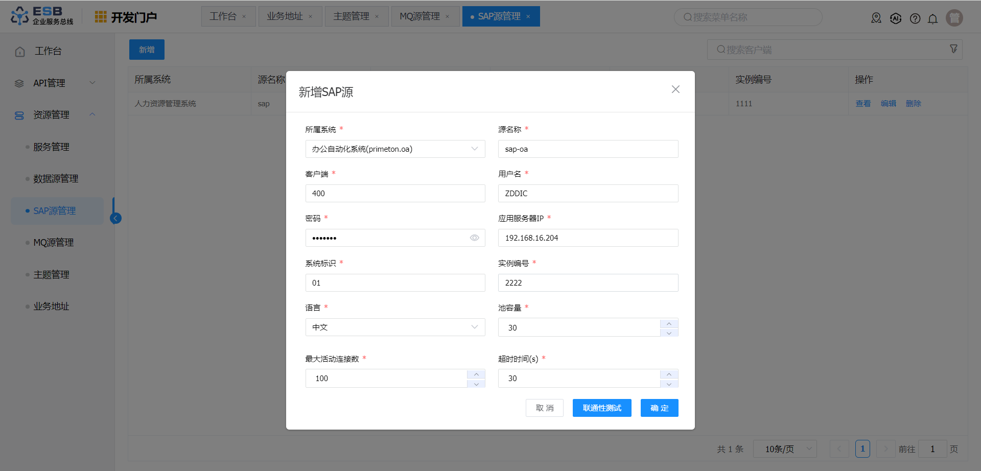 3. 点击“连通性测试”按钮,测试SAP信息填写是否正确。
