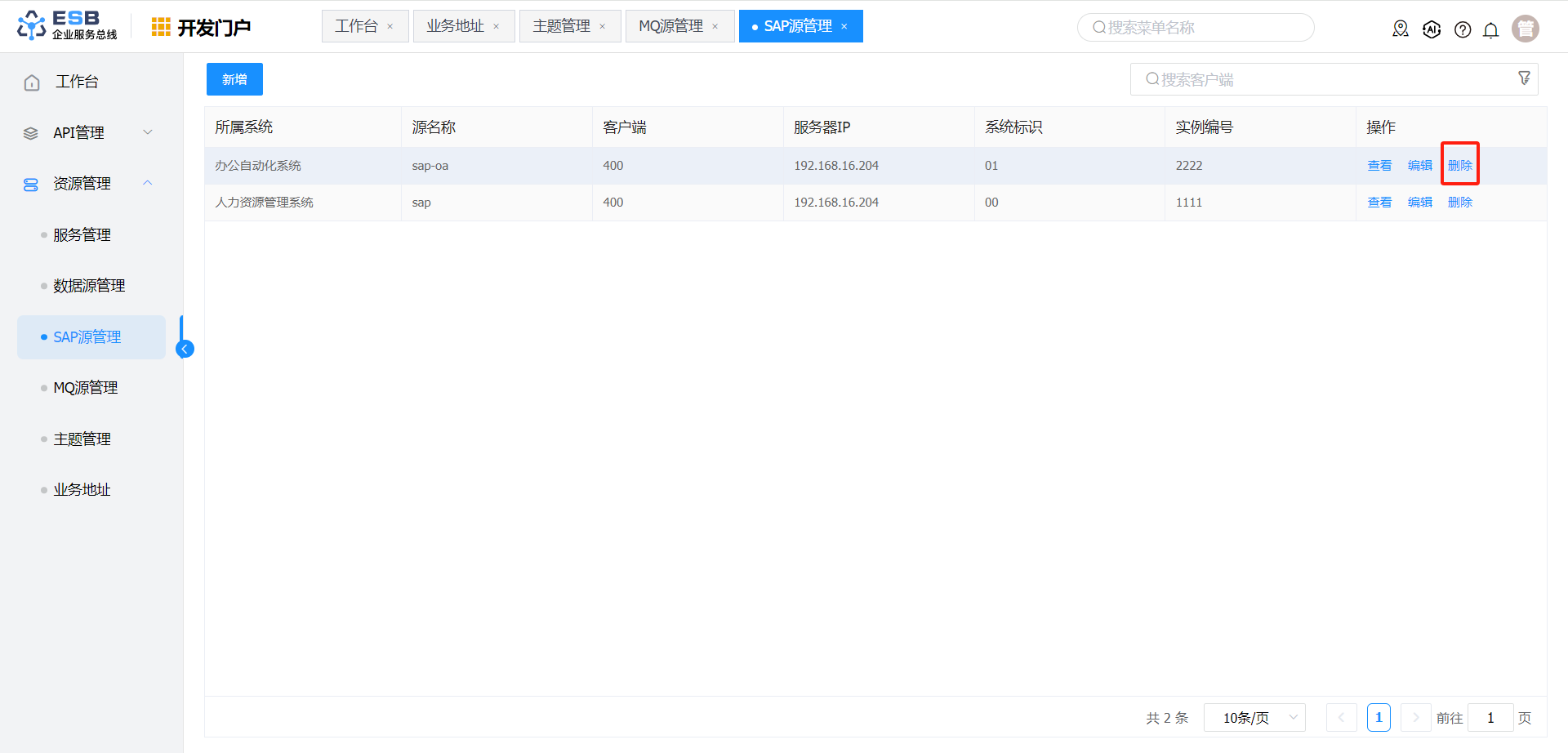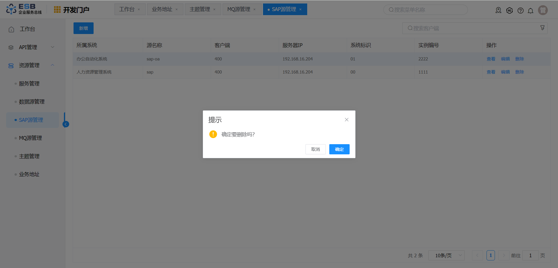 1. 在“SAP源管理”界面,选择一条需要删除的SAP源记录,单击操作列“删除”按钮,弹出删除确认的提示信息。