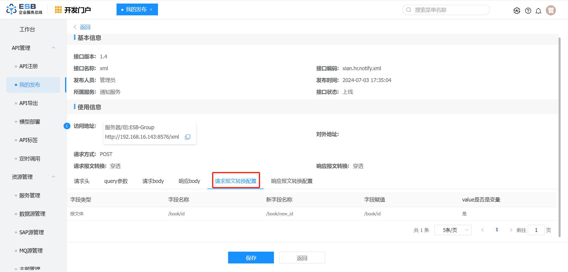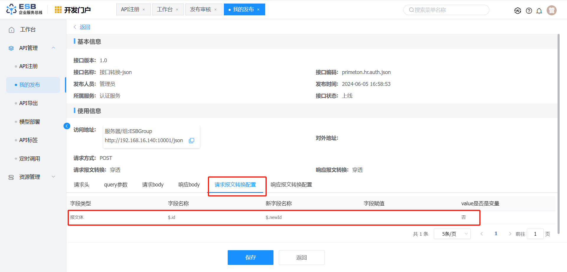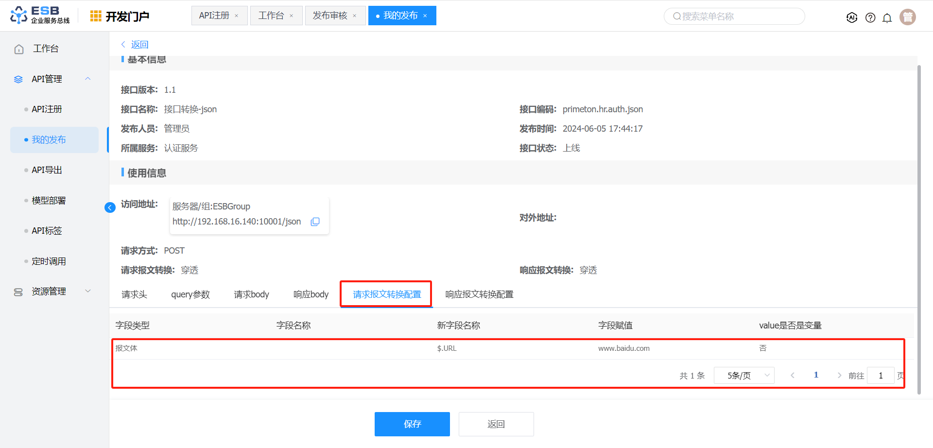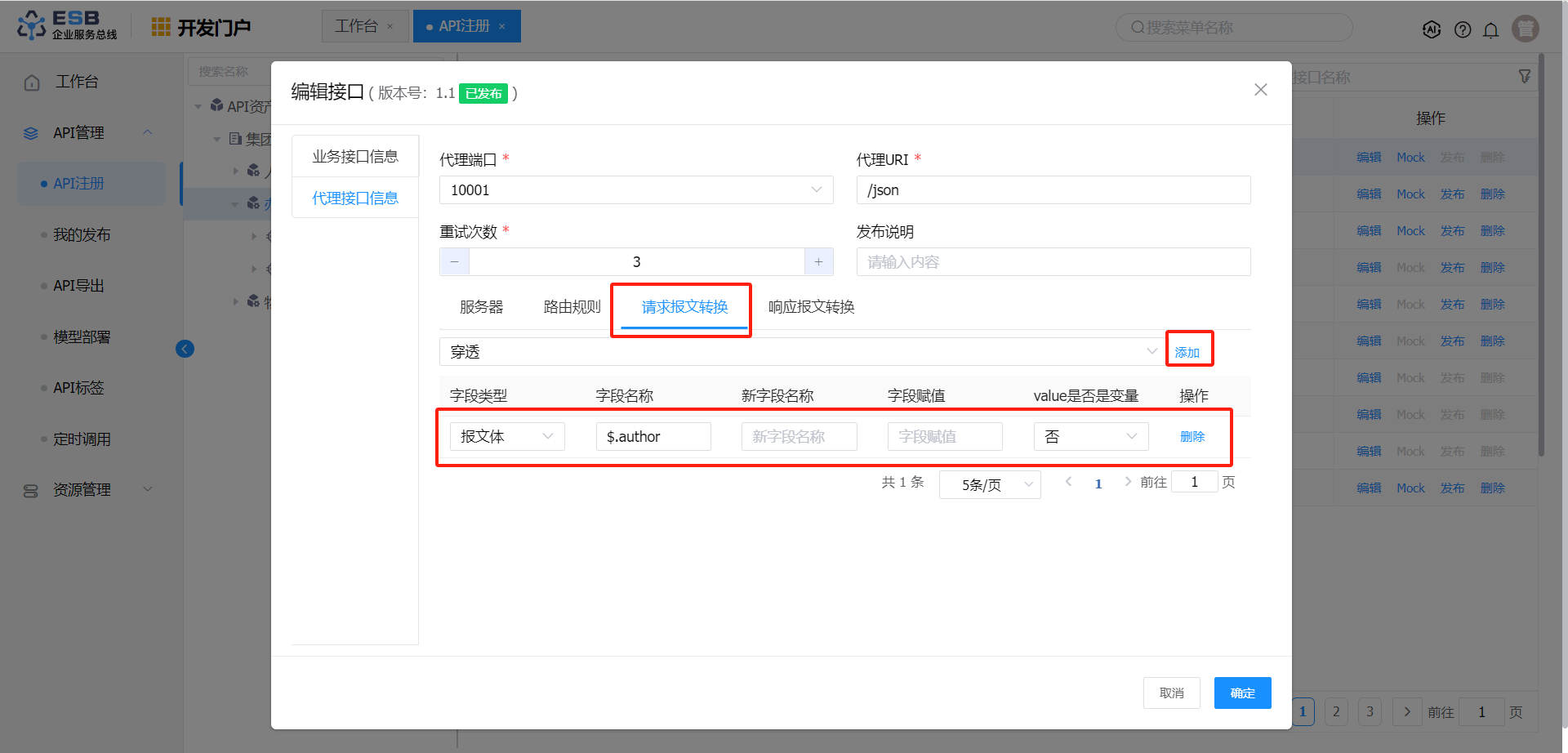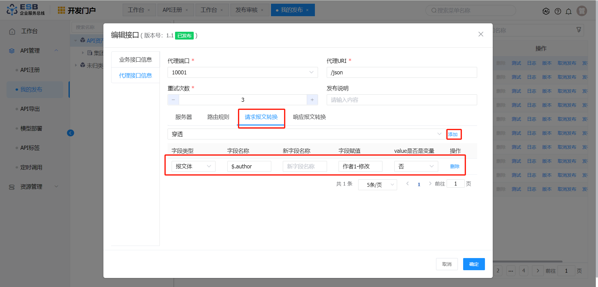 请求报文转换 报文体 $.author 作者1-修改 否