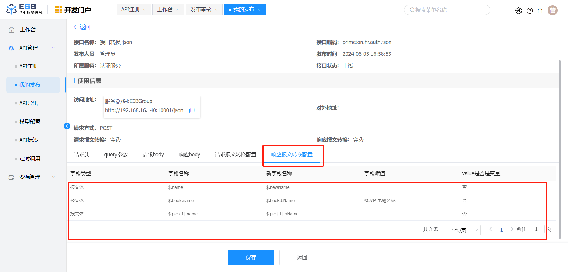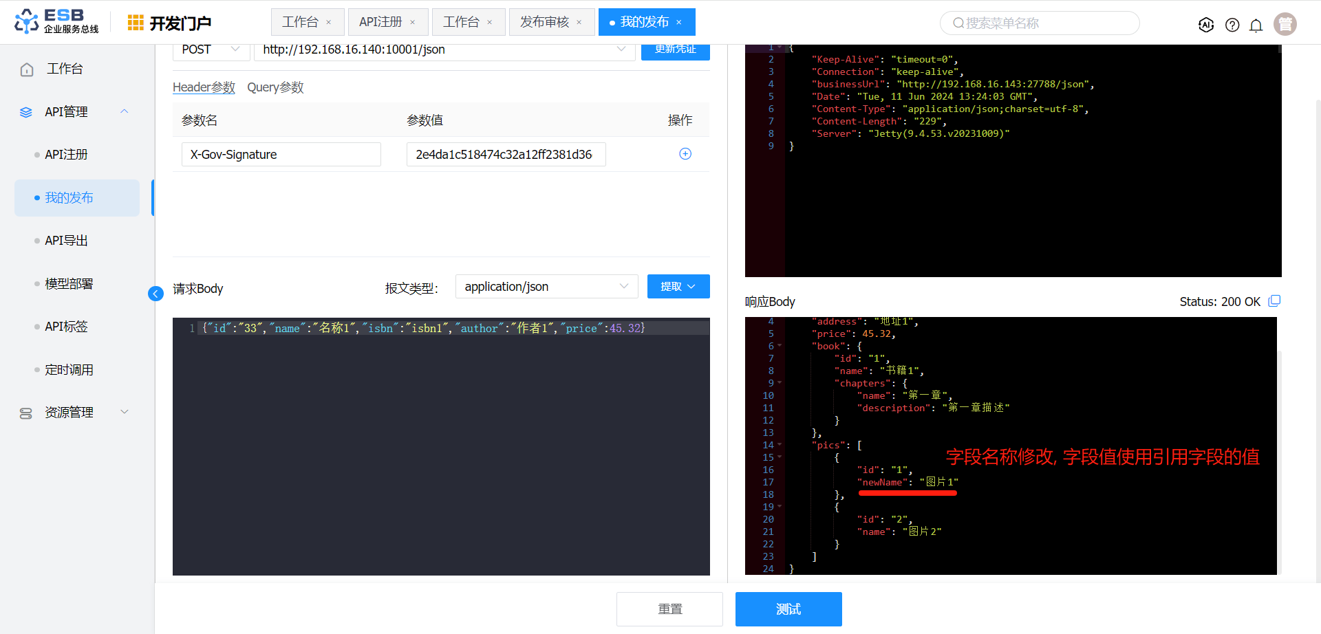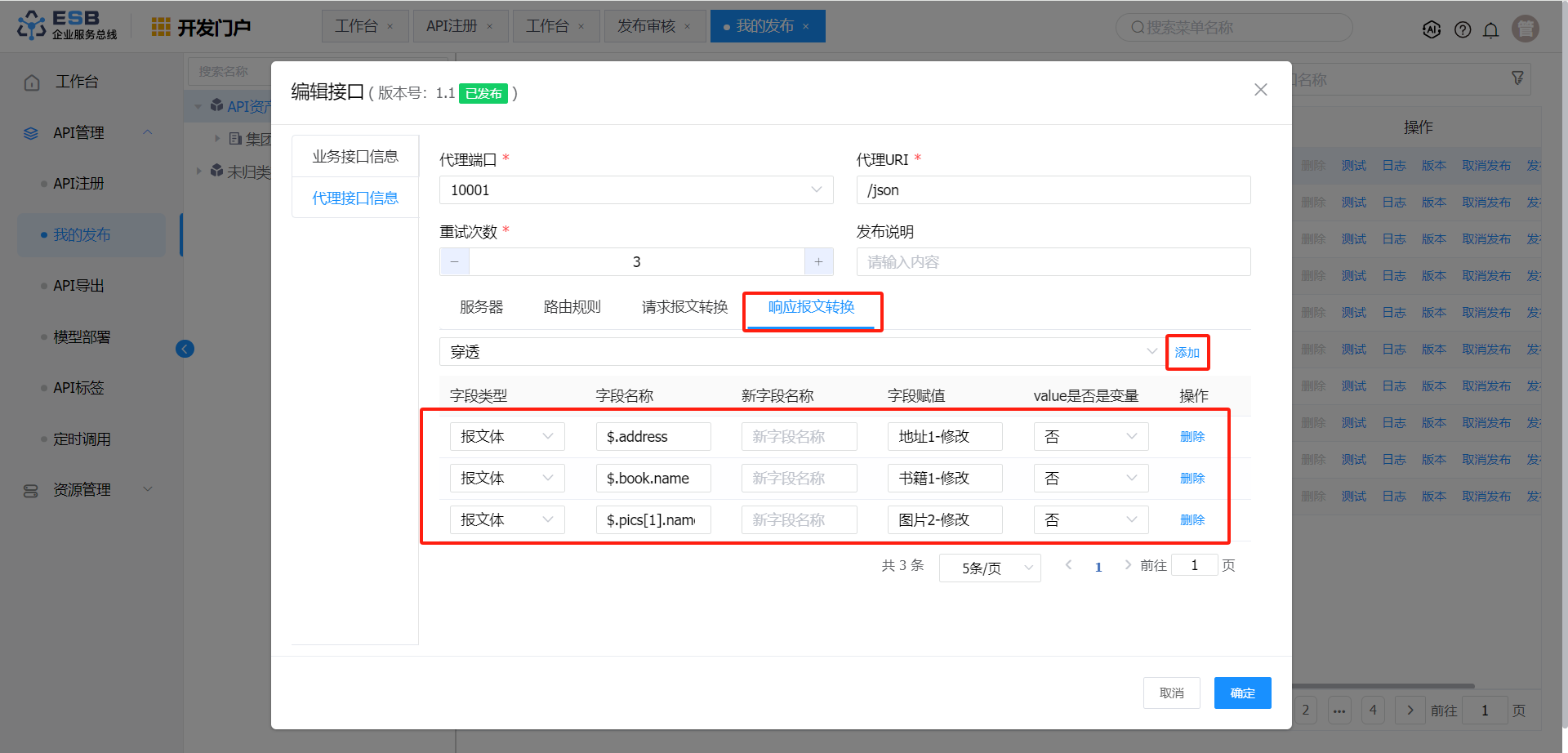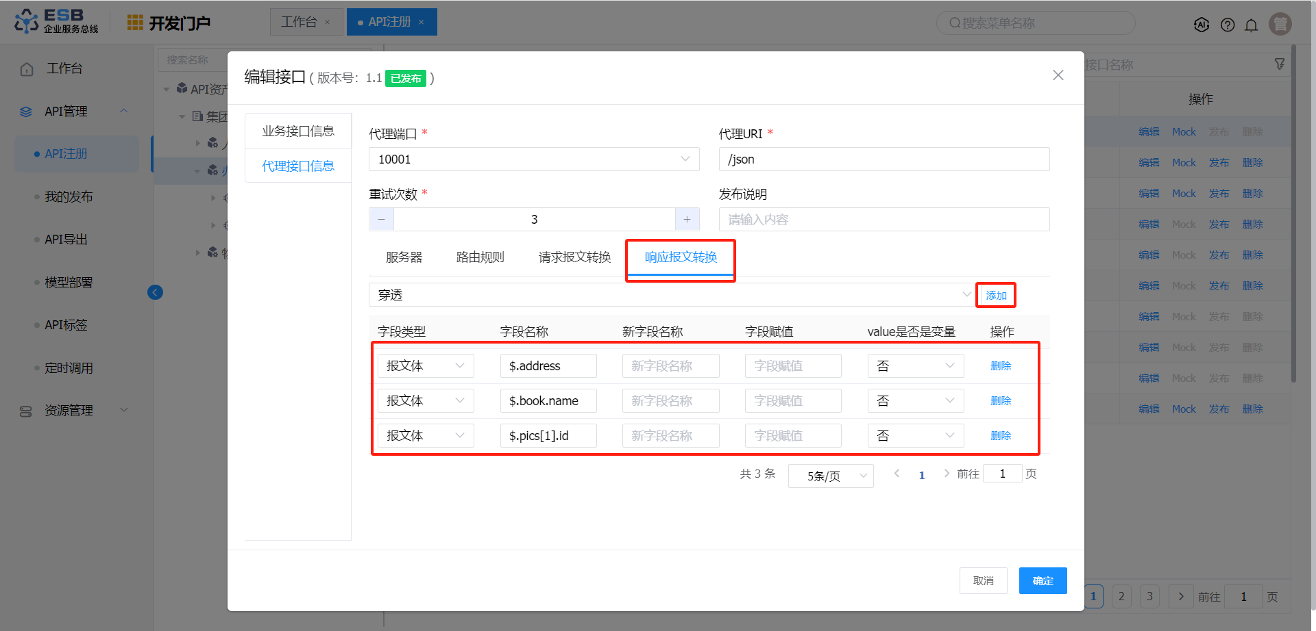 响应报文转换 报文体 $.book.name 书籍1-修改 否