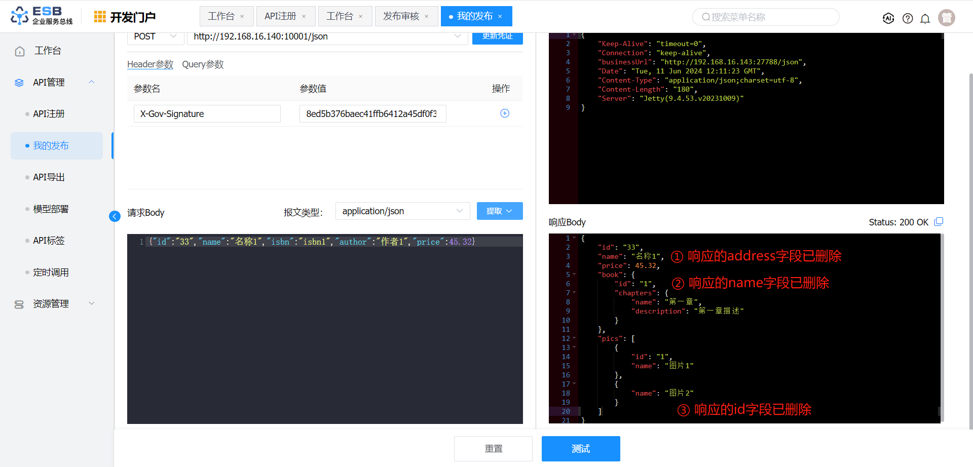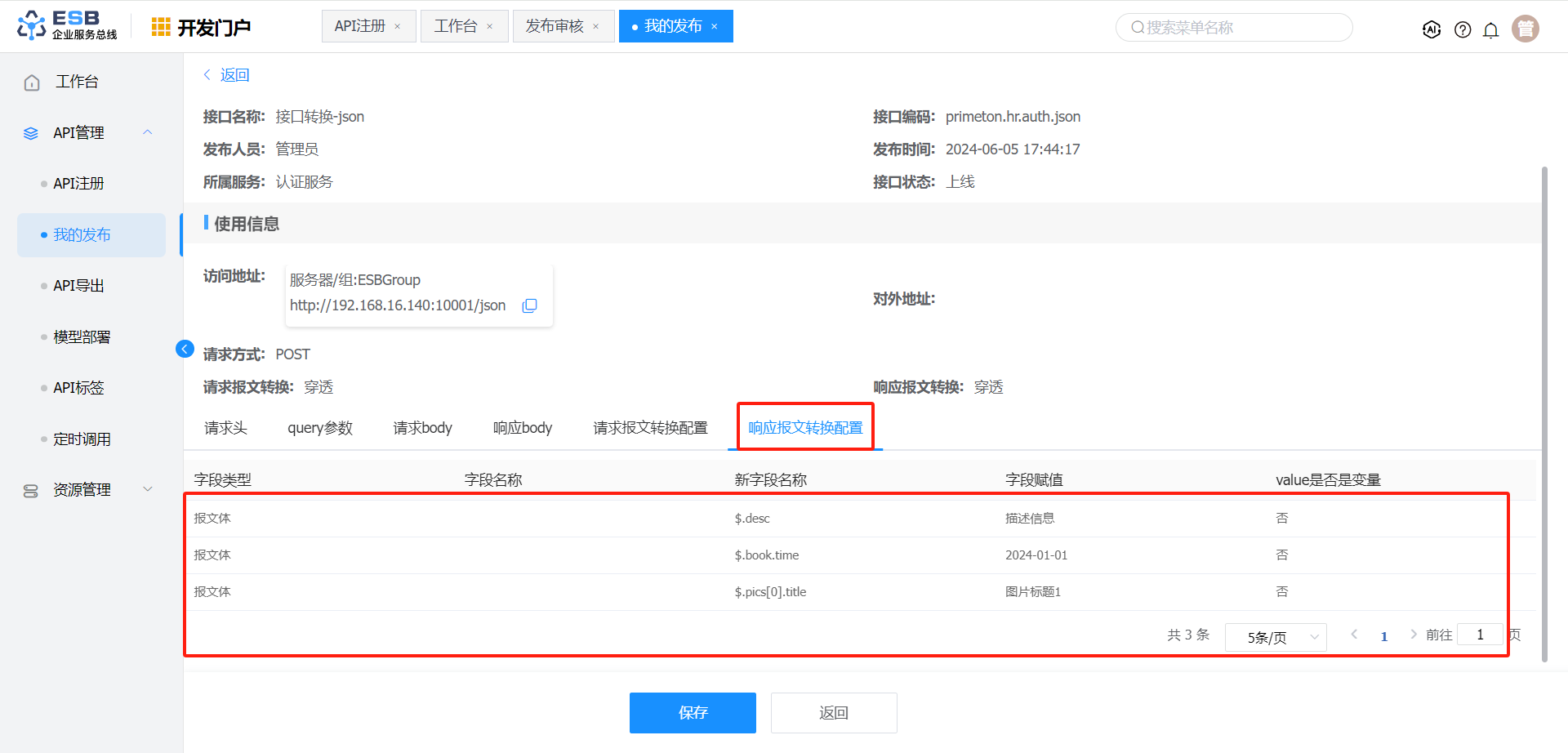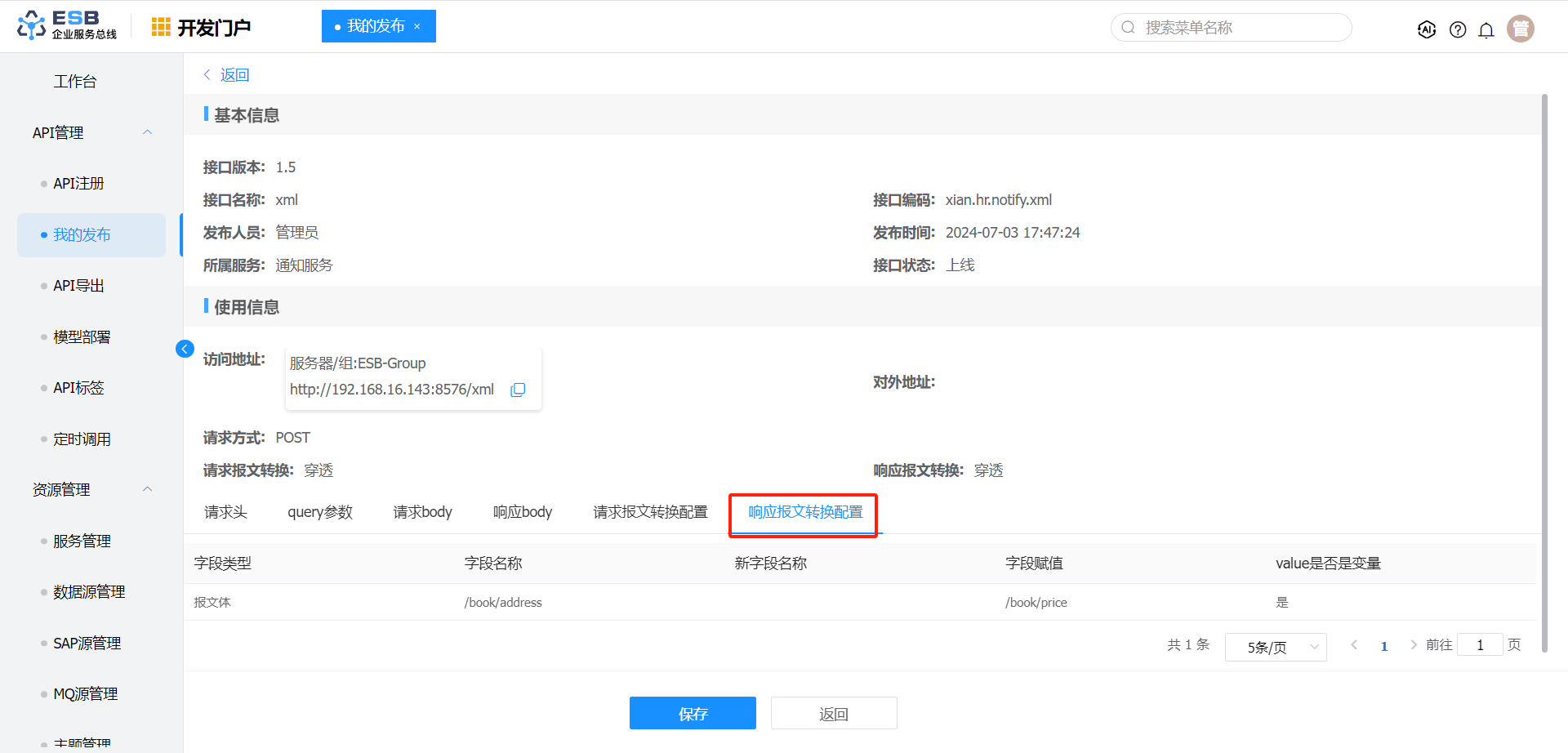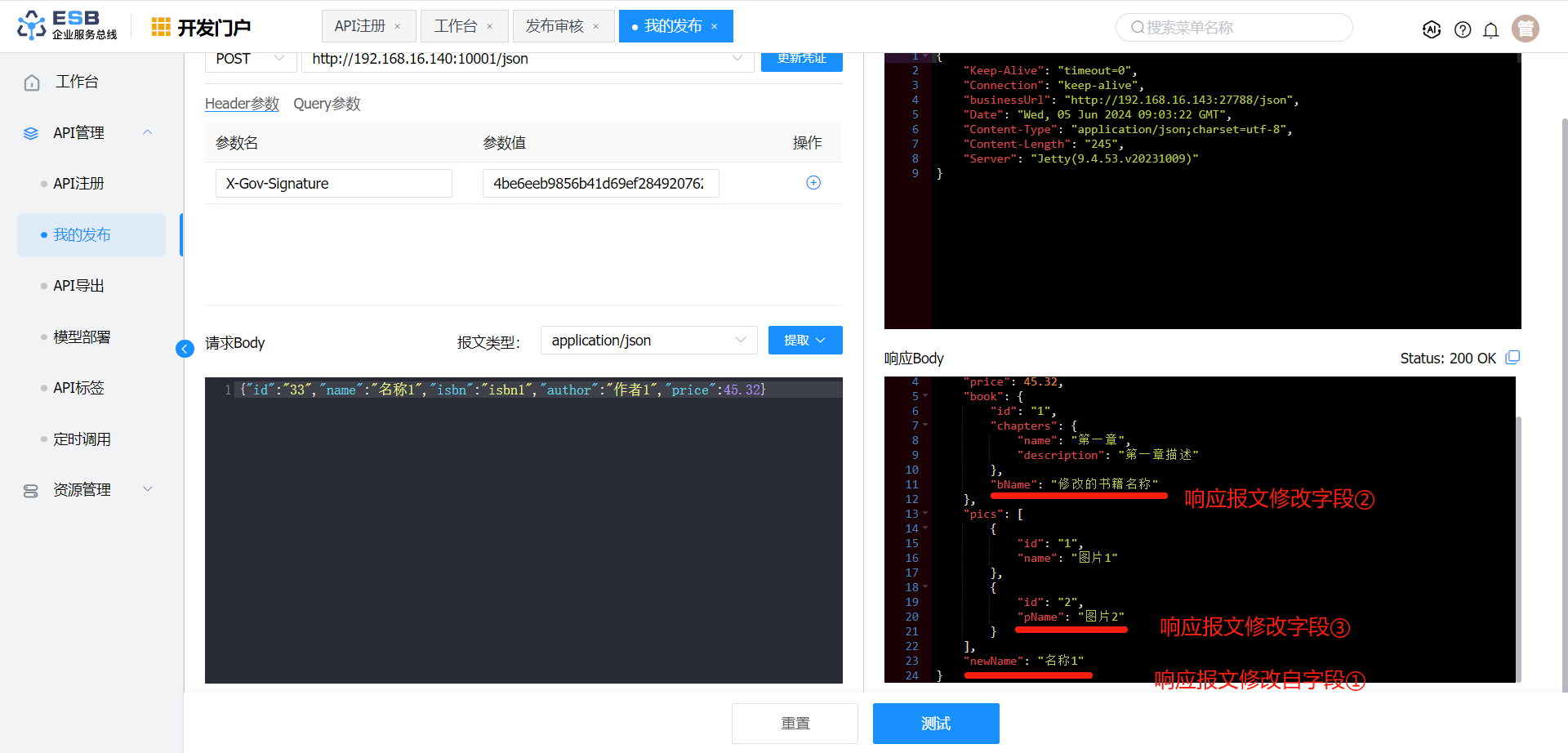 响应报文转换 报文体 $.book.name 书籍1-修改 否