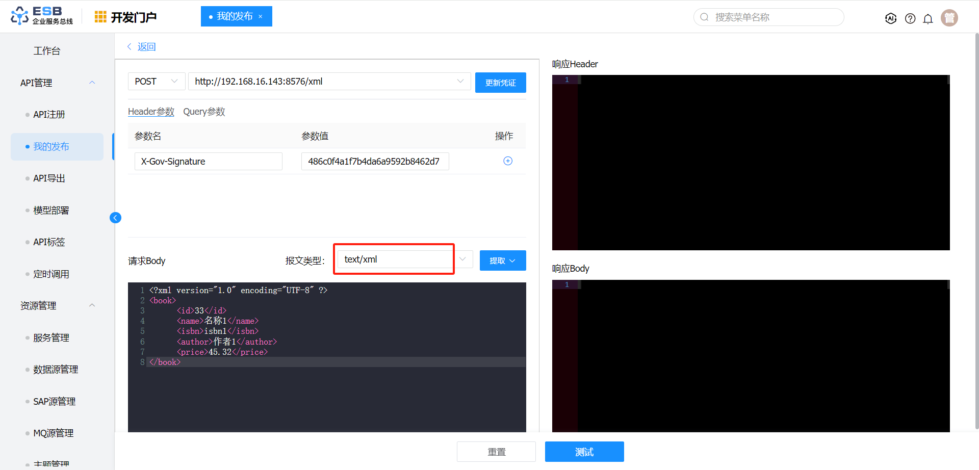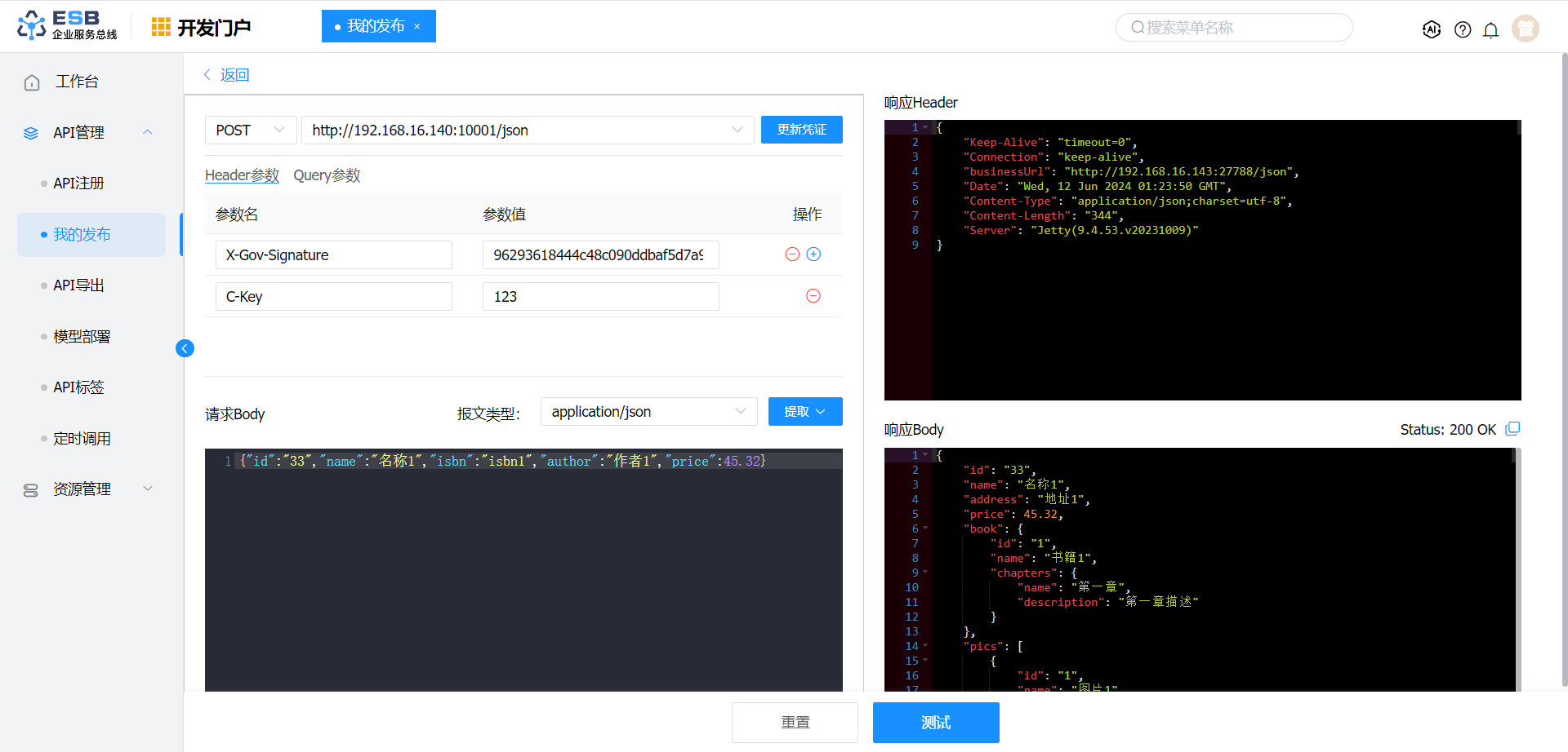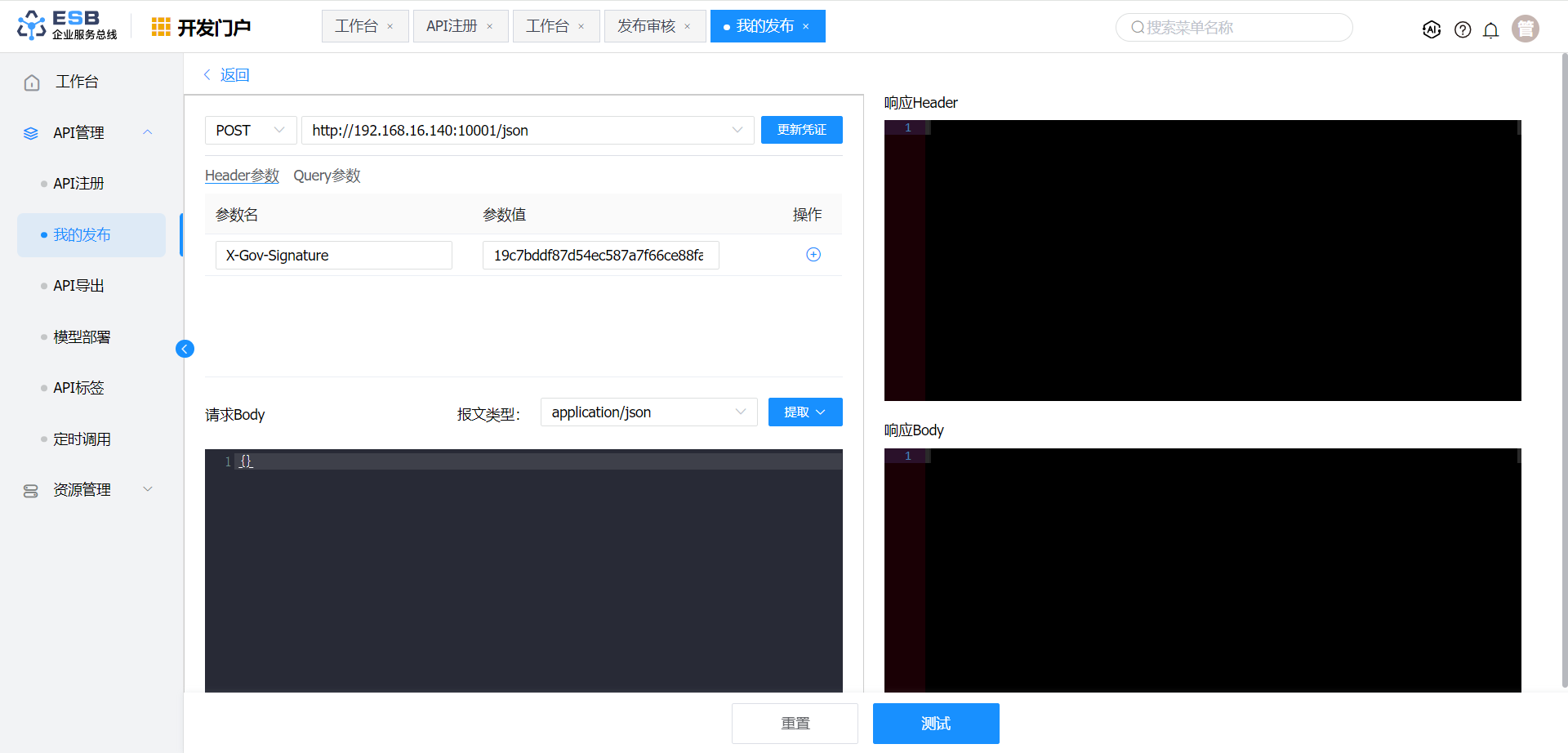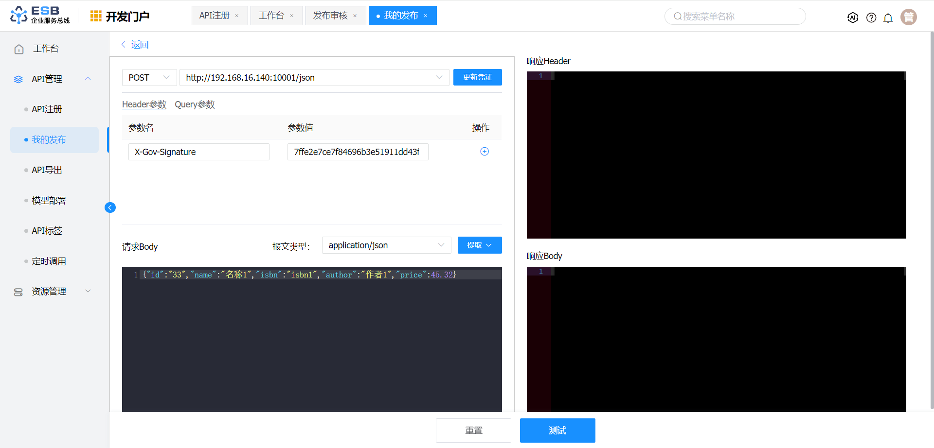 在"开发门户 > API管理 > 我的发布"页面,选择自己的接口,点击“操作”中的“测试”按钮,即可进入测试页面。